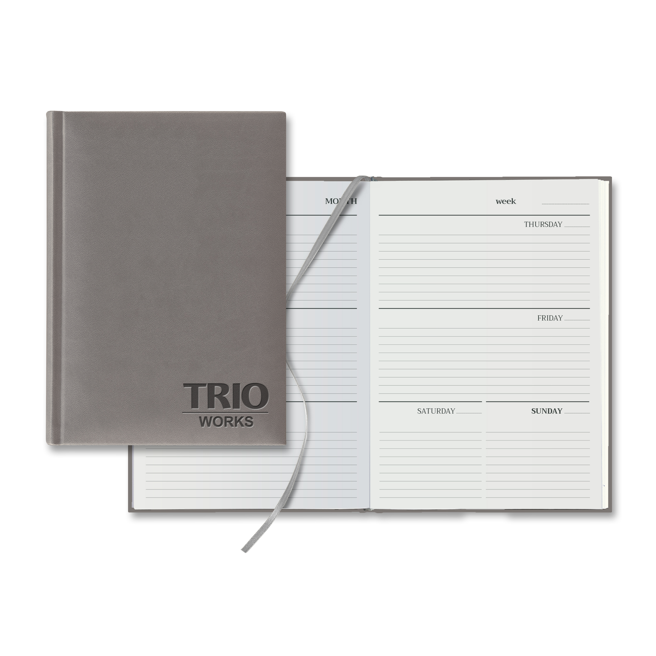 Measuring 7″ x 9 11/16″, this planner features a cover that has a smooth surface that’s often mistaken for leather This planner has the ability to be started any day, week or month! It’s also equipped with 192 white pages with black and gray printing and a silver ribbon marker.