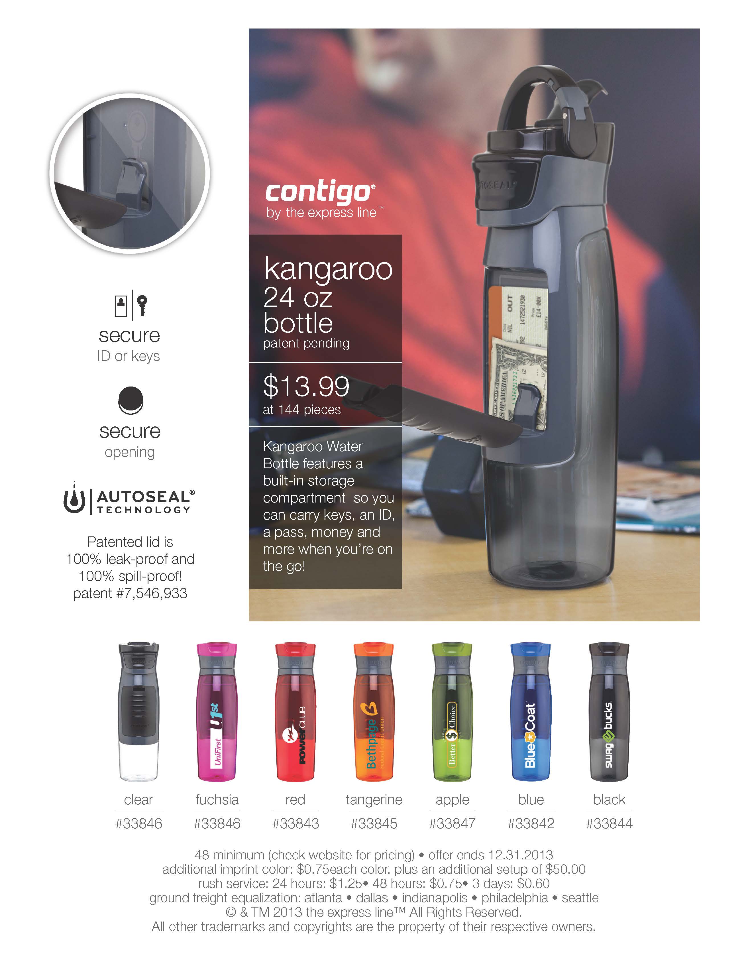 24 oz Contigo AutoSeal Kangaroo copolyester water bottle with push button opening and storage compartment with carabiner carrying loop.