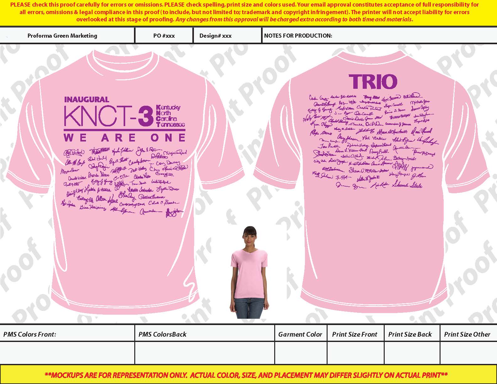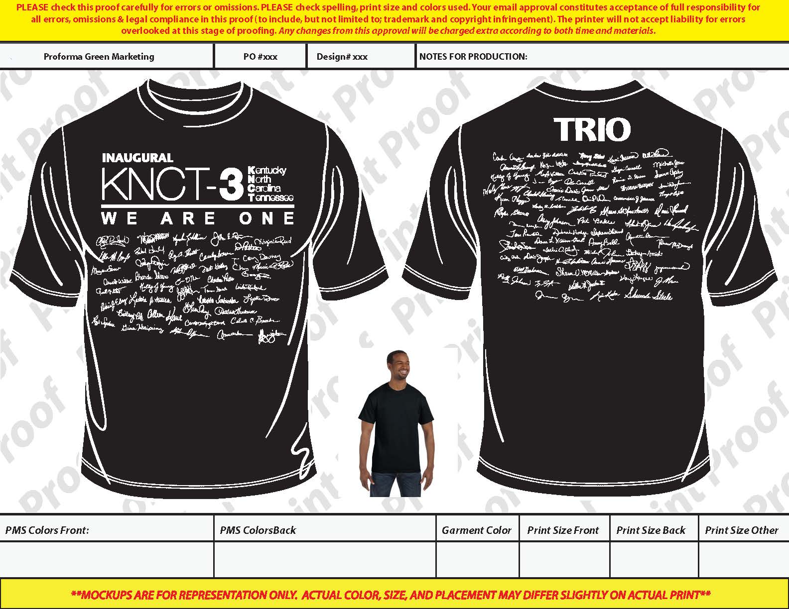 The Signature Tee shirt final layout with the names collected at the TRIO inaugural KNCT-3 conference is now complete. If you signed a form for this shirt, expect a call or email soon to get final information on your shirt size and mailing address. If you have any questions, or would like additional tee shirts, send an email to trio@proformagreen.com.