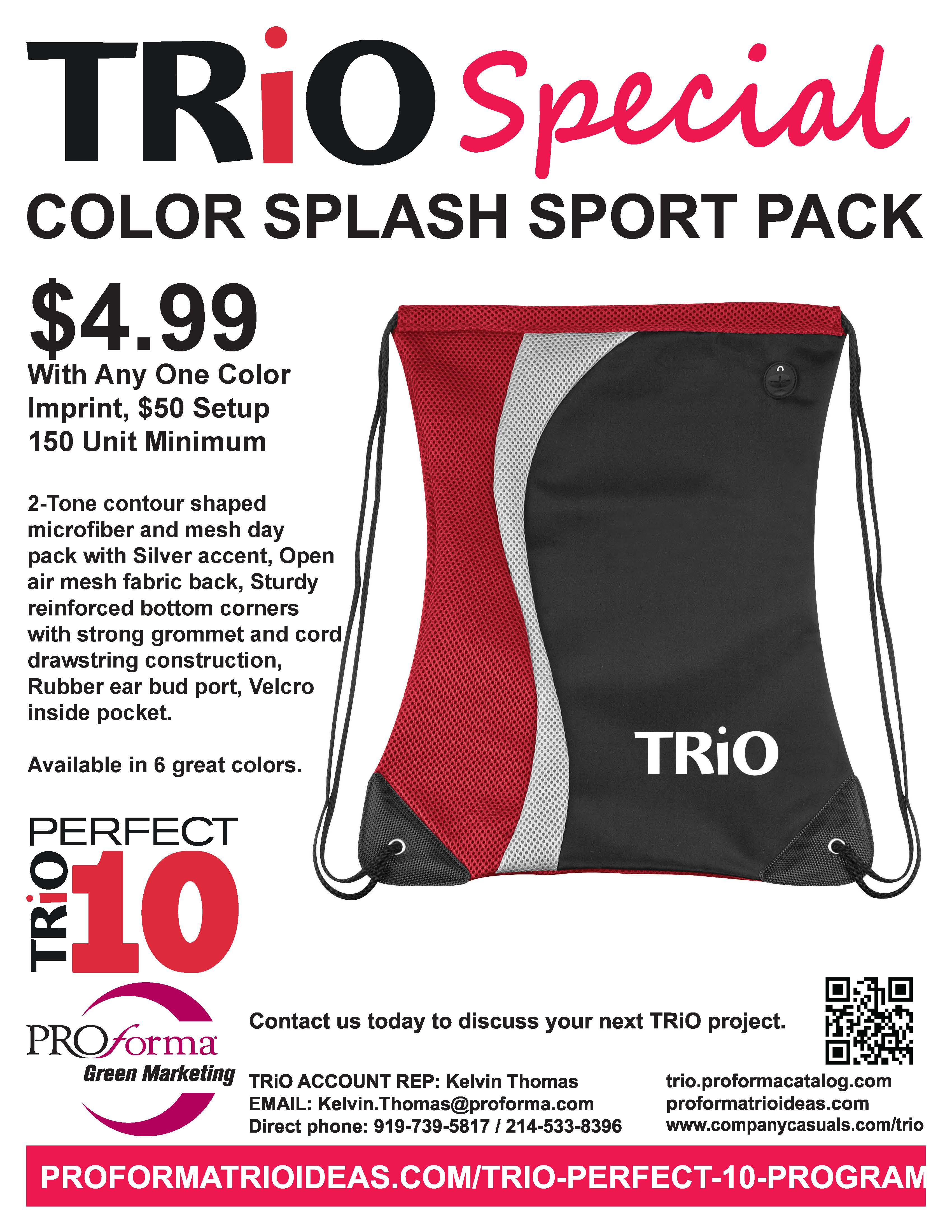 Color Splash Sport Pack – 2014 discount pricing with one color imprint $4.99 / 150 unit minimum. Can be run with any TRIO or program artwork. Stock colors: Blue, Red, Orange, Pink, Black, Green, Purple, Carolina Blue.
