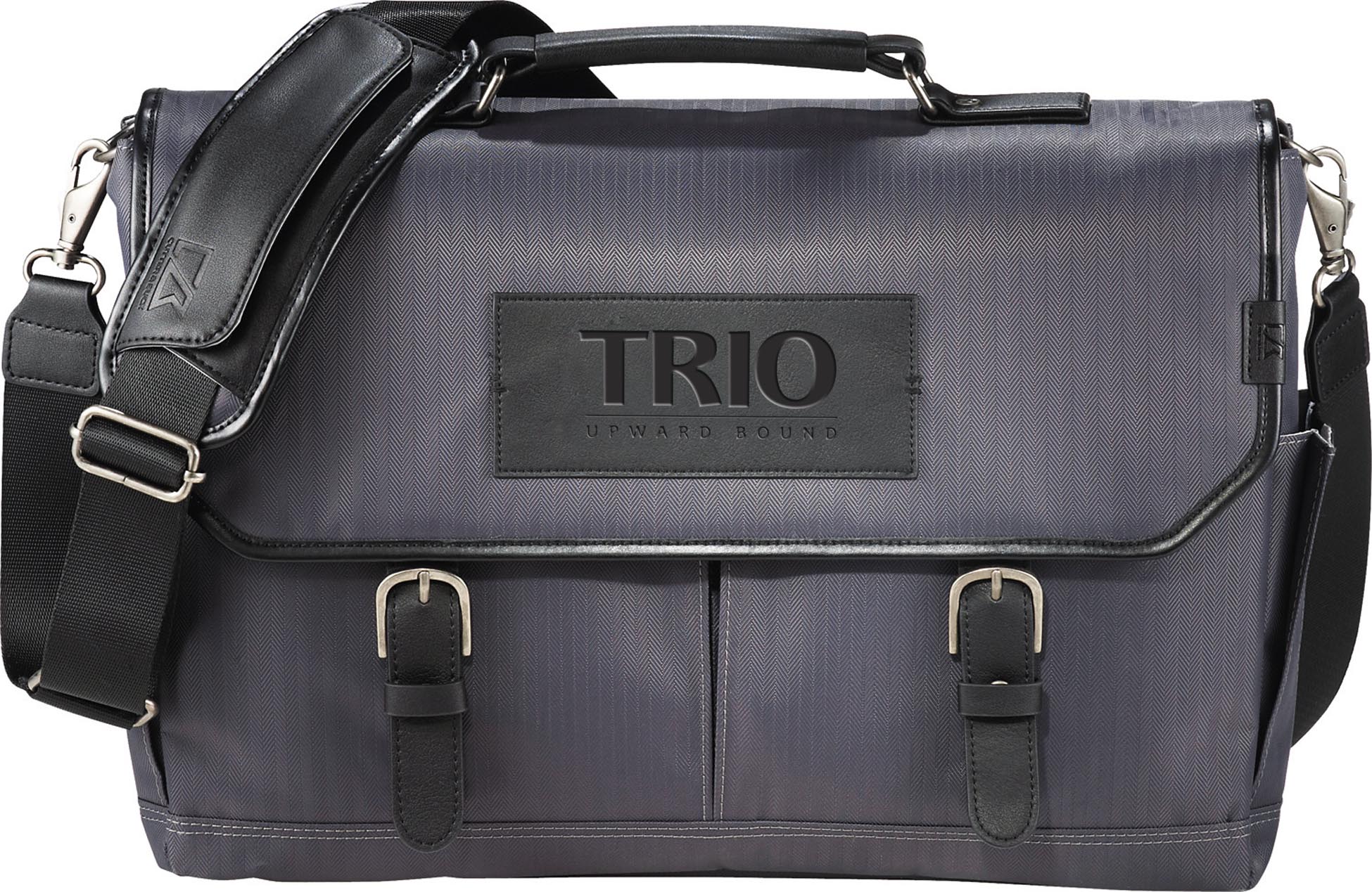Fashionable and built with high quality materials, this Cutter & Buck® messenger bag is built with the modern traveler in mind. Bag features unique herringbone gray pattern with leather accents with a trendy look, as well as a checkpoint-friendly design, iPad pocket, and organization for all your business needs. This bag will be sure to hold up for a long time no matter what you put it through. Features front pocket with organization, two side pockets, internal main compartment in addition to dedicated checkpoint-friendly laptop compartment. Padded adjustable strap and trolley pass-through. Unique Cutter & Buck® antique nickel hardware and unique Cutter & Buck® Pacific lining.