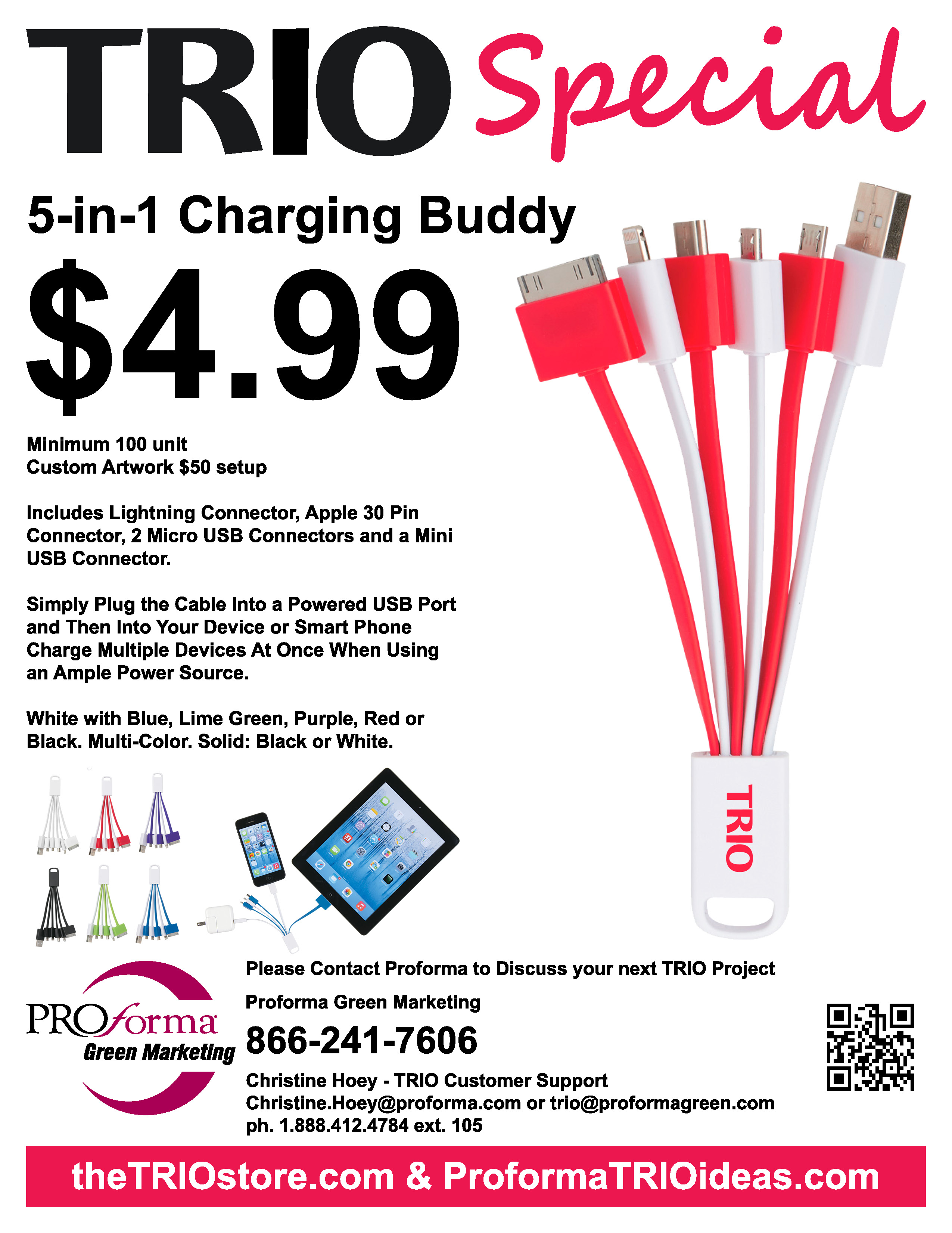 5-in-1 Charging Buddy – greatest idea ever for the students with portable technology. Simply plug the USB cable into power then use any arm to power up your portable electronics. Pair it with a portal charger to make a full on the move power station. TRIO Linear Flashlight/Powerbank, or TRIO Smart Charger, or TRIO Charge-It-Up Power Bank.