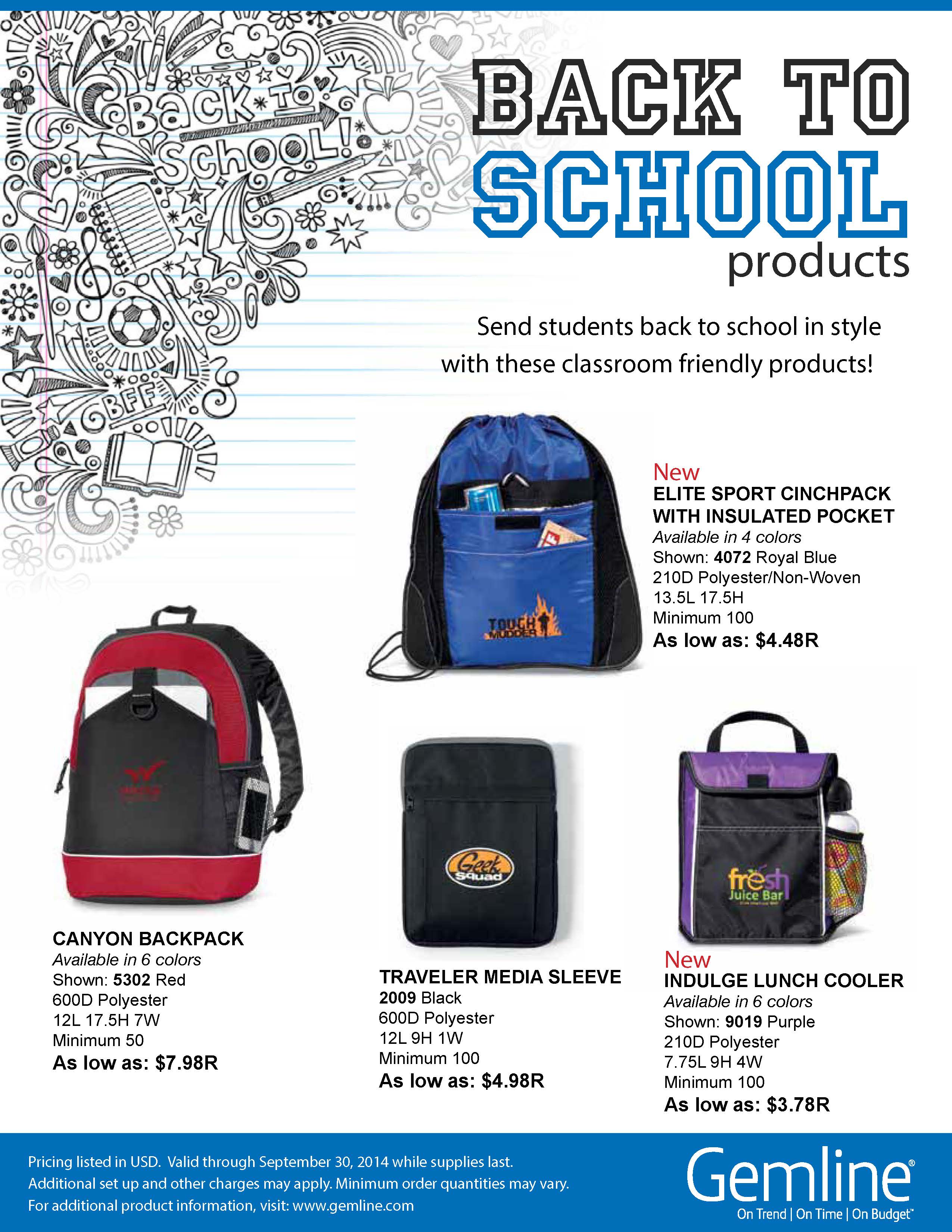 Our friends at GEMLINE are keeping the Back-to-School sales coming. Here are the latest flyers to hit the office. Samples of most bags are also available on request.