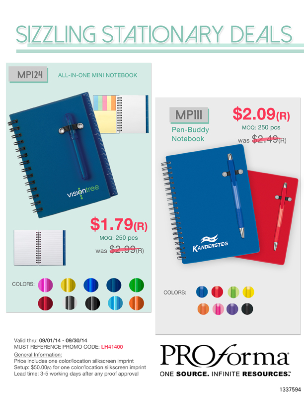 Sizzling Stationary Deals for TRIO from our friends at Sweda. Price shown includes any one color imprint, and Proforma is waiving setup fees, so send us any one color art you wish.