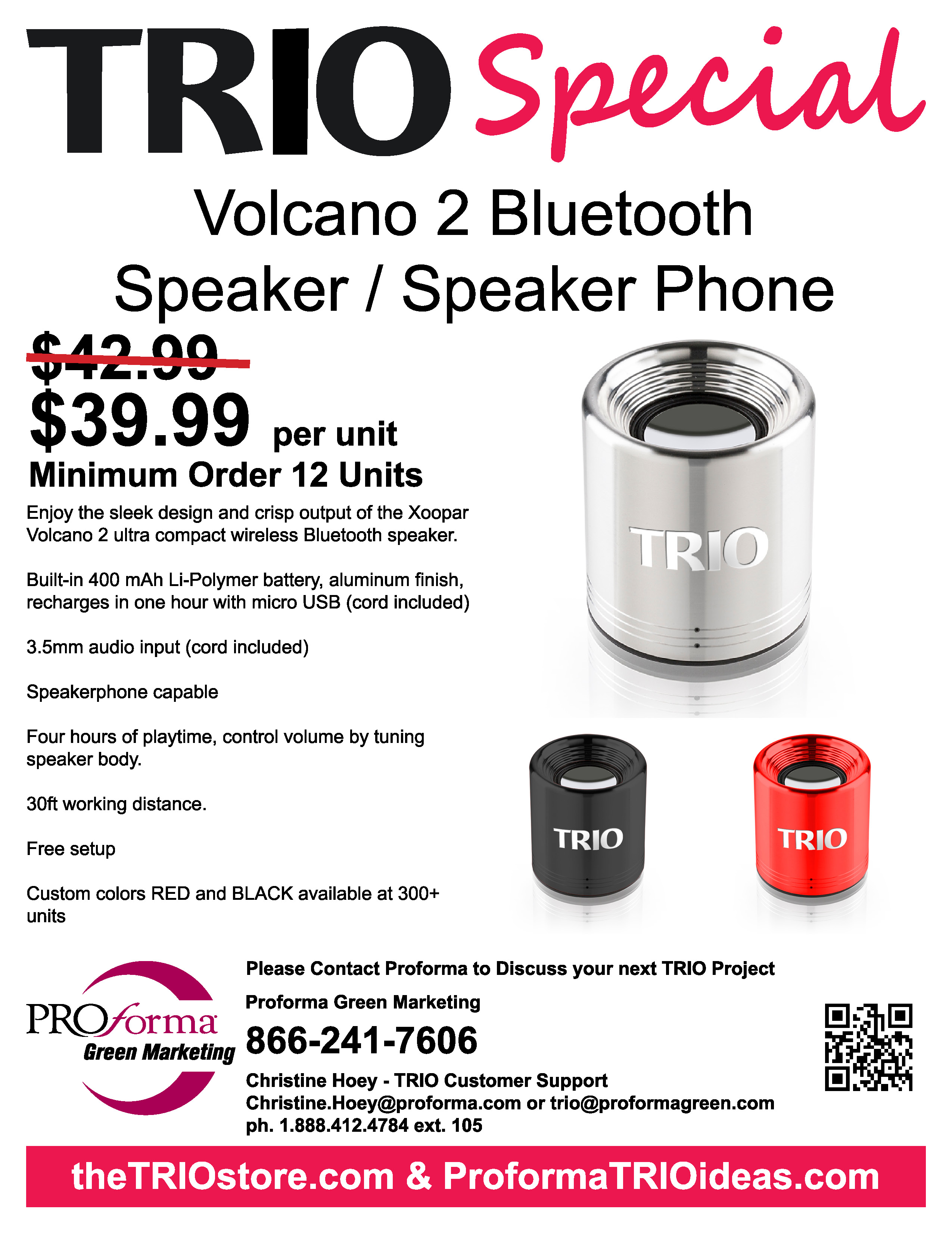 Volcano 2 Bluetooth Speaker – Best in show new item at COE national convention in Washington DC. Come and HEAR the demonstration at the Proforma booth in the vendors area, across from registration.