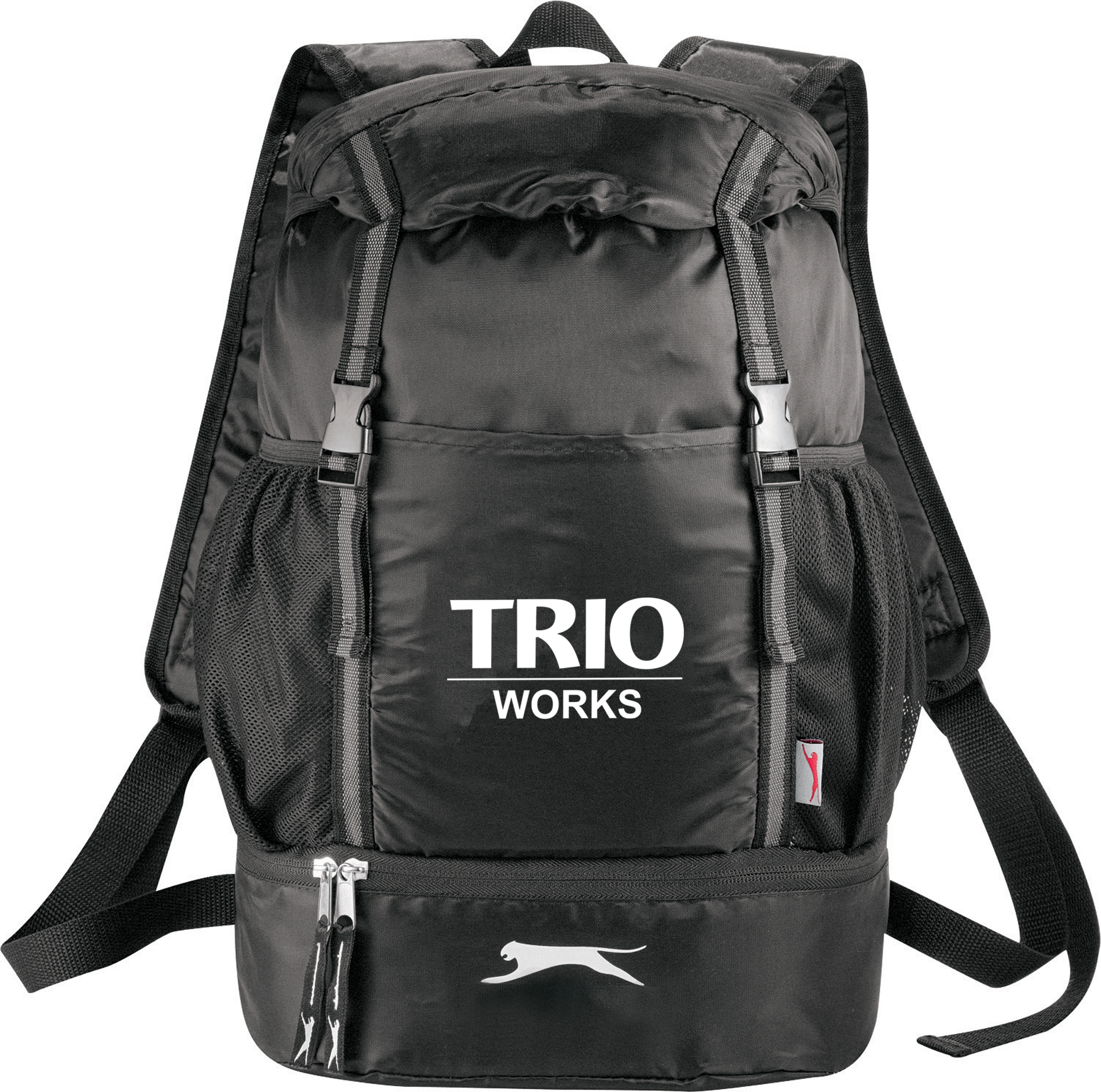 Large main compartment with pull-cord closure. Protective flap closes with reflective trim and hardware. Open front pocket. Two side mesh pockets. Zippered drop-bottom compartment. Adjustable, padded backpack straps. Signature Slazenger™ hardware and logo.