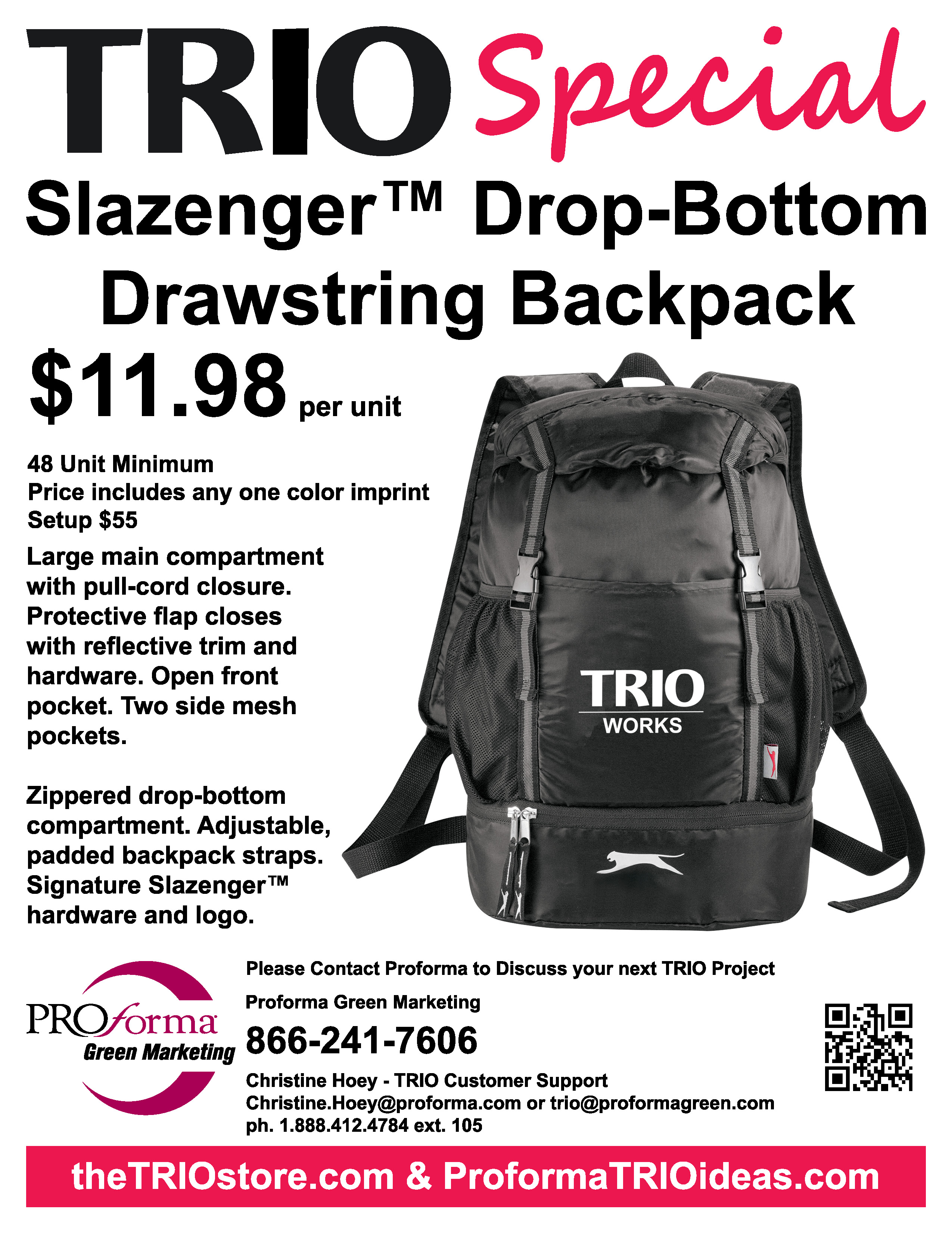 TRIO asked, and Proforma answered. The new Slazenger™ Drop-Bottom Drawstring Backpack is now available. Same high quality as you would excecpt from a Slazenger™ bag, just a simpler model and a lower price point. Please contact us for more information, of if you wish to see a sample.