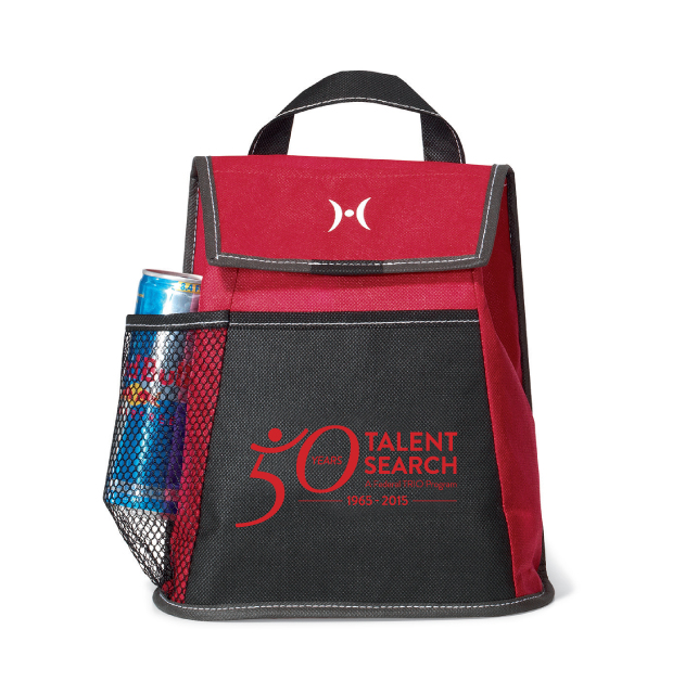 Velcro closure. Front and top slash pockets. Side mesh water bottle pocket. Removable ID tag on back. 5 can capacity. Thermal lining. Top grab handle. PVC free. Phthalate free. Multiple decoration locations available