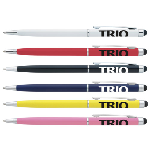 Slim profile multi-function pen featuring a ballpoint and I-PAD/ I-Phone touch stylus. Glossy colored barrel featuring shiny metal trim.
