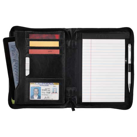 Zippered closure. Interior organizer with gusseted file pocket. Front pocket. 3 business card holders. Pen loop. Clear ID or calculator window. Holds Kindle and Nook products. Includes 5″ x 8″ writing pad.