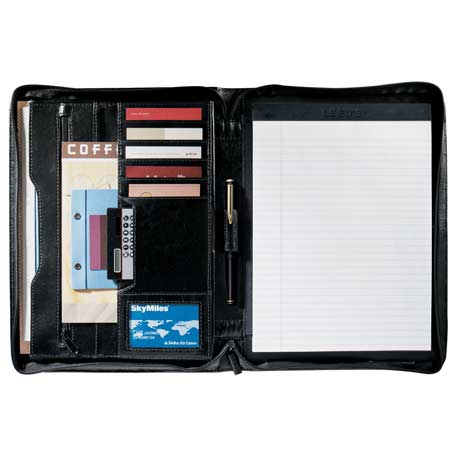 Zippered closure. Interior organizer with gusseted file pocket, business card pockets and calculator pocket. Front pocket. Pen loop. Includes 8.5″ x 11″ writing pad.