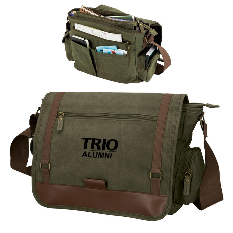 This messenger bag is made from 16 oz. cotton canvas and features leatherette accents, a zippered pocket on the front flap, two side pockets with both hook and loop and zip closures for accessories. There are a zippered pocket under flap, large main zippered compartment with accessory pocket and zip pocket, and a backside pocket. Proforma can run with any stock or custom TRIO imprint,.