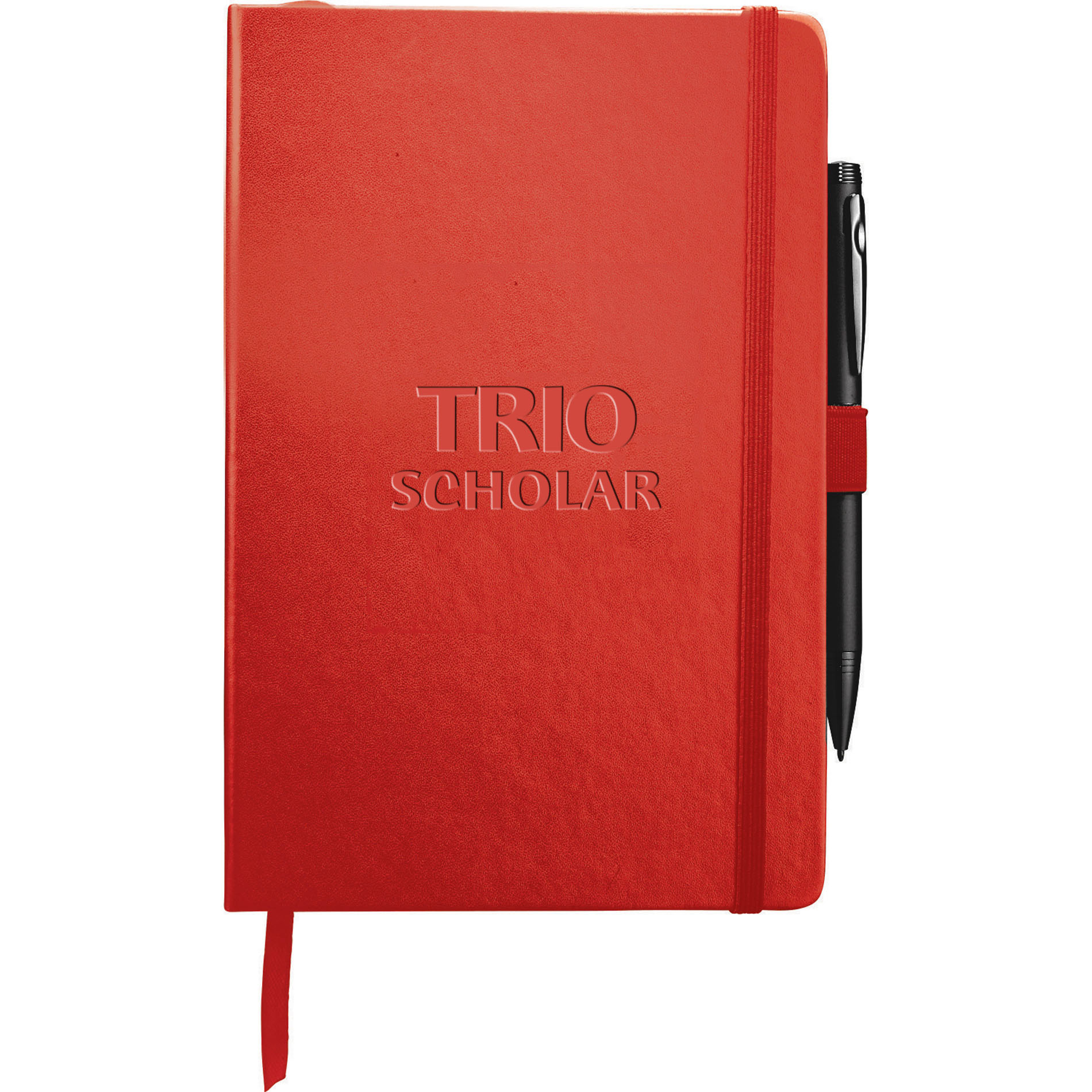 Set includes Nova Bound JournalBook™ and Ambassador Square Ballpoint. Faux, leather like hard cover journal with built-in elastic closure. Ribbon page marker. Expandable accordion pocket. Includes 96 sheets of lined white paper.