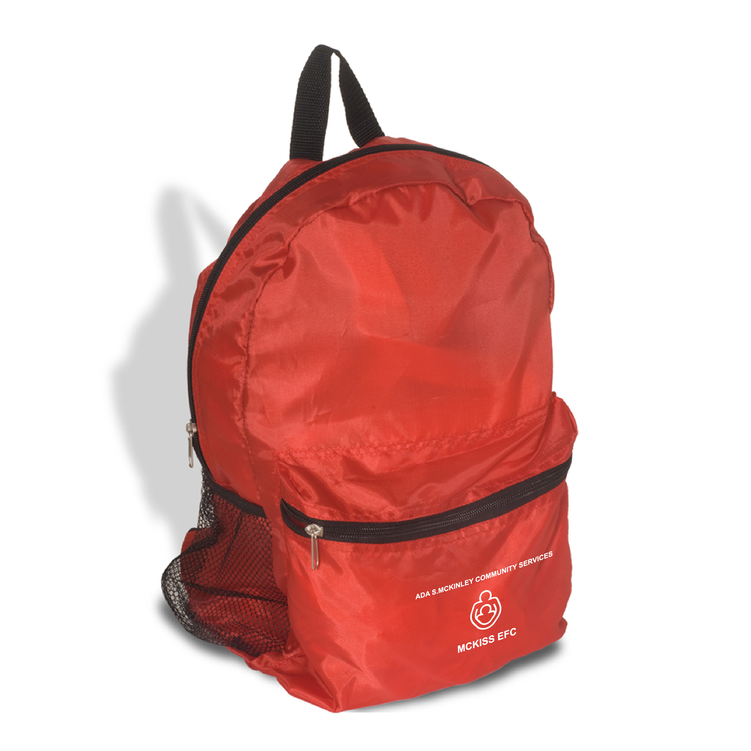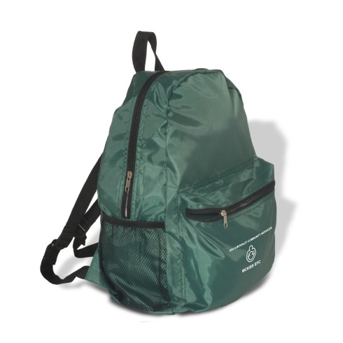 Backpack made of 210D Polyester w/ PU backing. Dual-zippered main pocket, zippered front pocket, and adjustable shoulder straps Side Polyester mesh pocket with elastic edge. Recommended weight tolerance: 11 lbs.