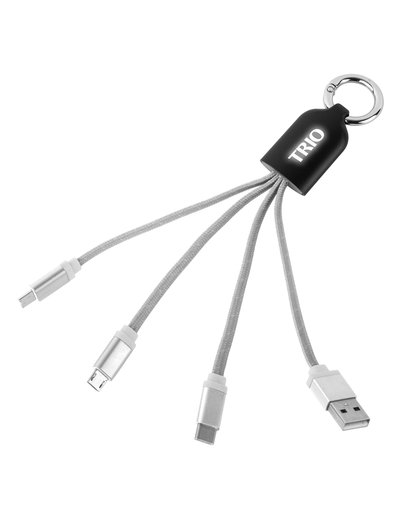 4-IN-1 LIGHT-UP CHARGING MULTI-CABLE. INCLUDES USB, TYPE-C, MICRO USB, AND 2-IN-1 LIGHTNING/MICRO USB; FLAT BRAIDED CABLES WITH METAL CONNECTOR HEADS; SILVER SPLIT RING.