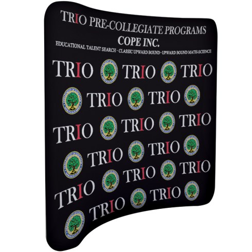 This display is approximately 8′ wide. Artwork is dye sublimated on polyester knit. Graphic cover slips over the frame like a pillowcase, then zips shut.