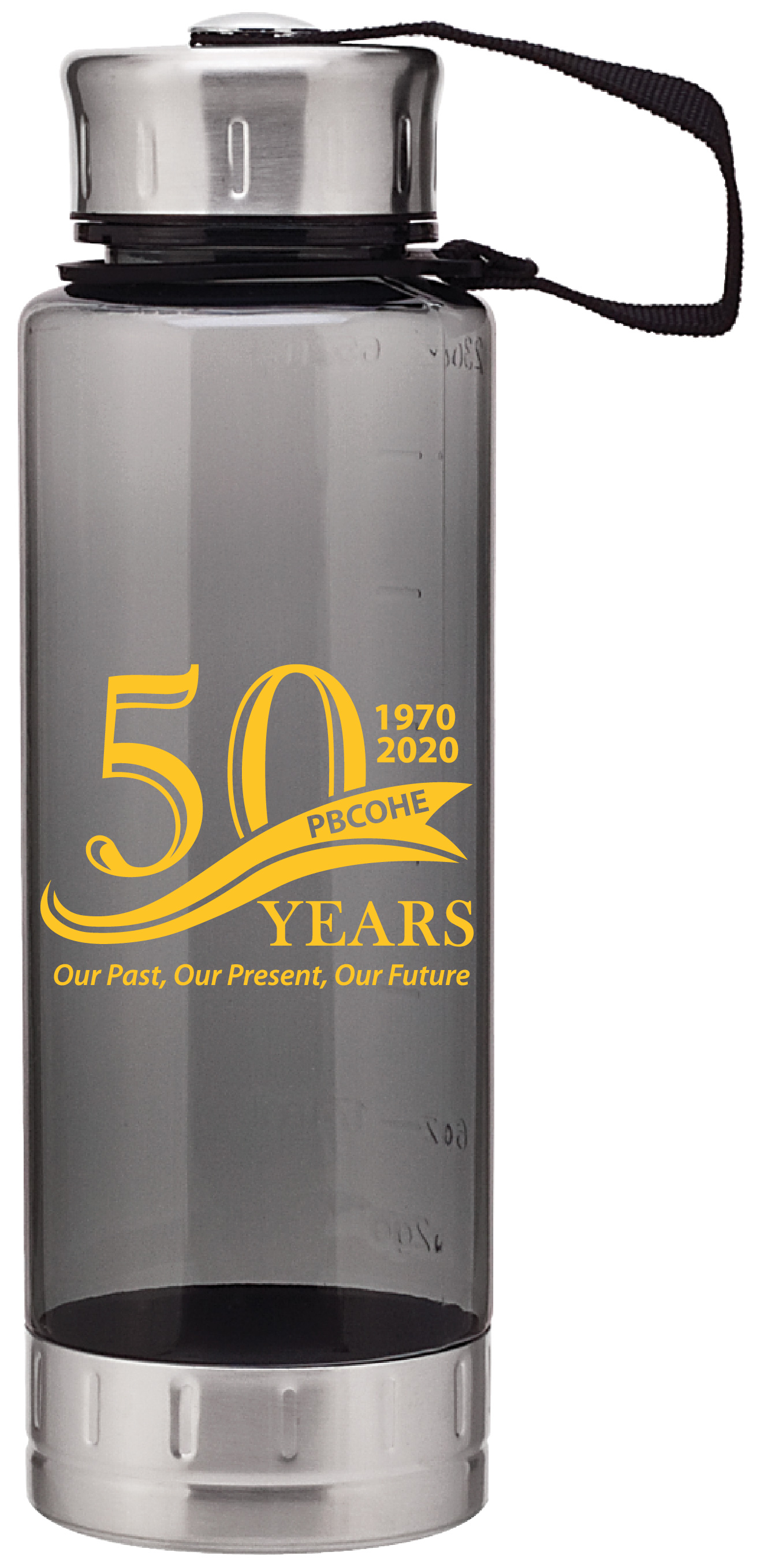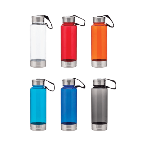 23 oz single wall acrylic bottle with threaded lid, lid retaining strap, and stainless steel lid and base.