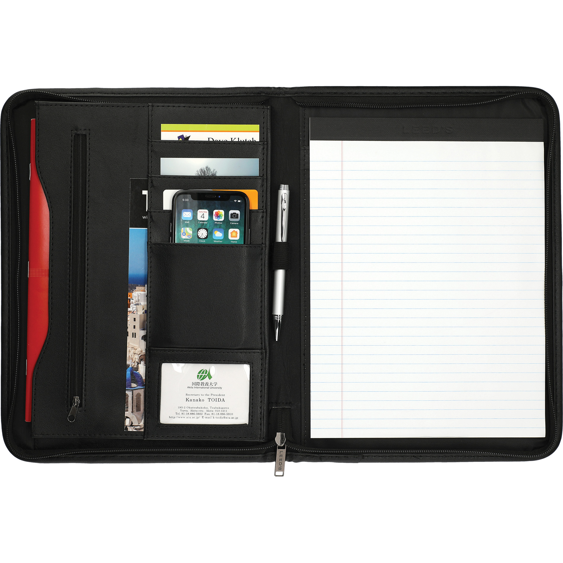 Zippered closure. Interior organizer with gusseted file pocket. Clear ID or calculator pocket. Front slot pocket. Includes 8.5″ x 11″ writing pad.