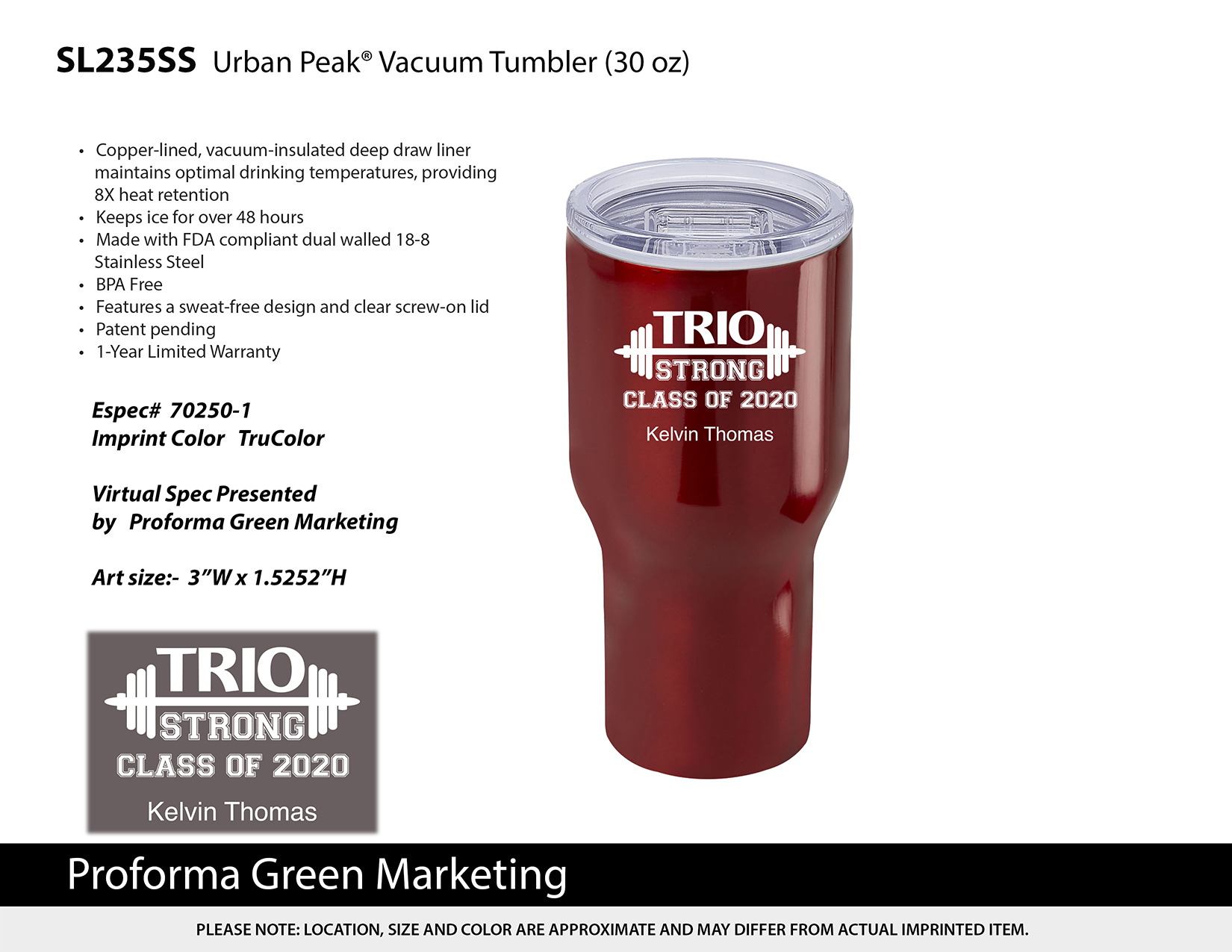 30 oz Urban Peak® Vacuum Tumbler Copper-lined, vacuum-insulated deep draw liner maintains optimal drinking temperatures and provides 8X heat retention. Dual walled 18-8 Stainless Steel. Lead-free vacuum seal. Features a sweat-free design and thumb-slide, screw-on lid. Keeps ice for over 48 hours. Patented.
