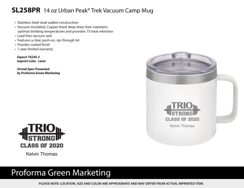 14 oz Urban Peak® Trek Vacuum Camp Mug Stainless Steel dual-walled construction. Vacuum-insulated, Copper-lined deep draw liner maintains optimal drinking temperatures and provides 7X heat retention. Lead-free vacuum seal. Features a clear push-on, sip-through lid. Powder-coated finish.