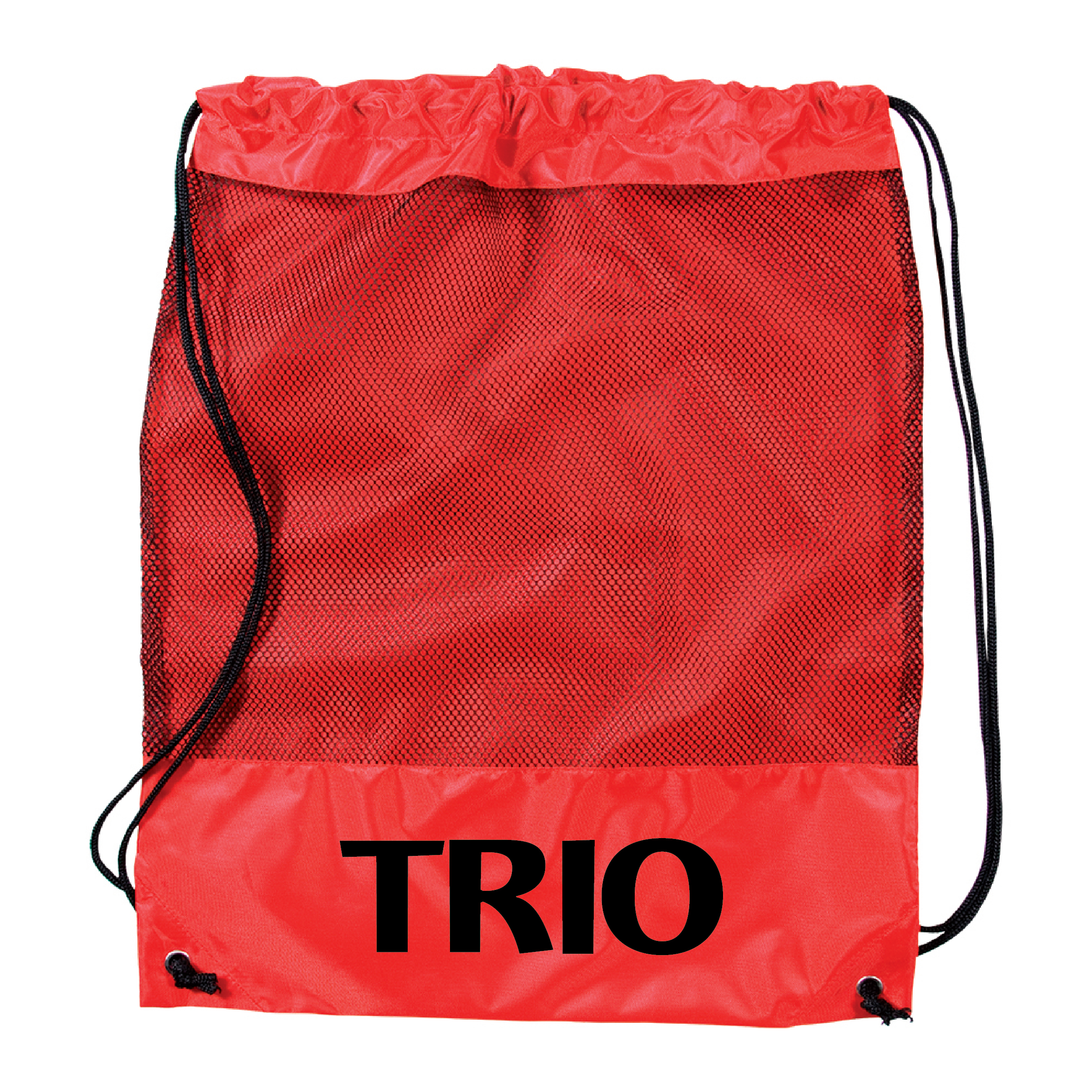 Made of strong 210D Polyester with mesh panel detail for easy viewing. Spacious interior with classic drawstring cinch top closure. Adjustable soft Nylon cord shoulder straps.