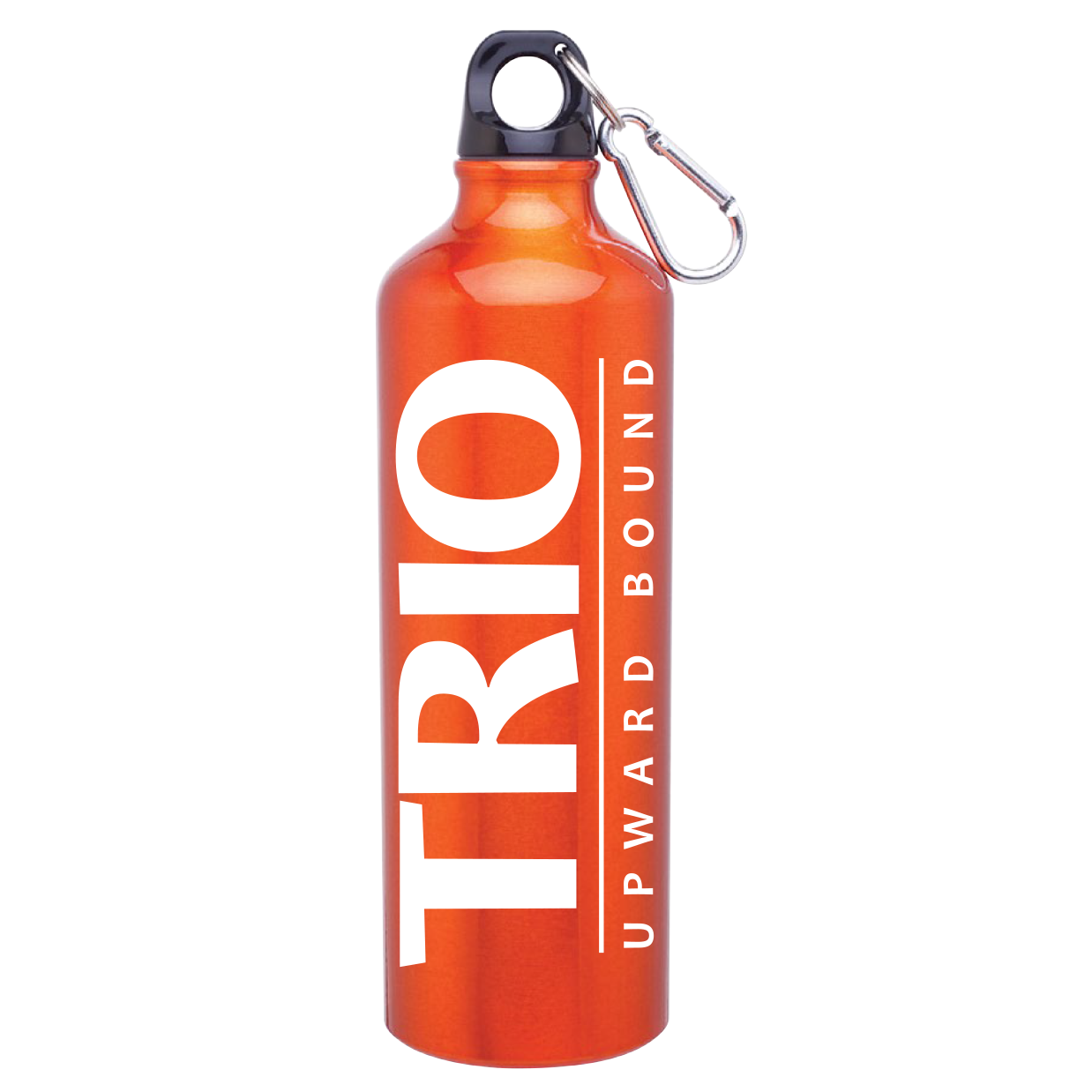 24 oz single wall aluminum water bottle with threaded lid, carabiner, and key ring · carabiner and key ring polybagged inside bottle.