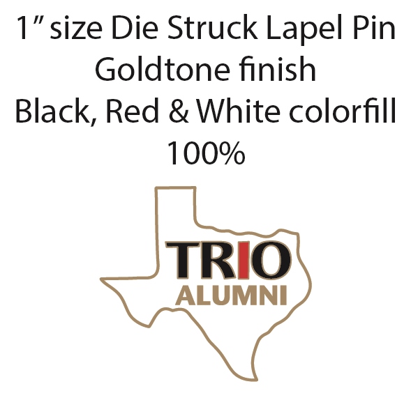 Texas Alumni TRIO Lapel Pin. Sold as shown. “TRO” capital letters in black, with “I” in red. 1″ x ~ 5/8″ Die Struck Lapel Pin Bright Goldtone Finish Black, White, Red (PMS 186c) Soft Enamel Colorfill. Individually polybagged