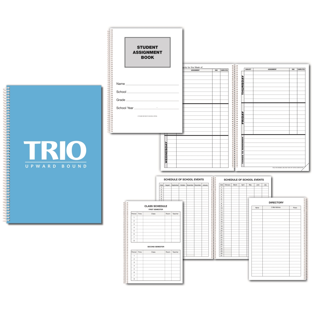 Weekly school assignment book with white 10 pt. cover printed one to full color with clear coat. Contains 50 lb. white offset inside sheets, student contact sheet, class schedule, school events schedule and e-mail directory. It has all the organizational necessities for the busy student, plus your imprint on the cover. Plastic coil bound on left side.
