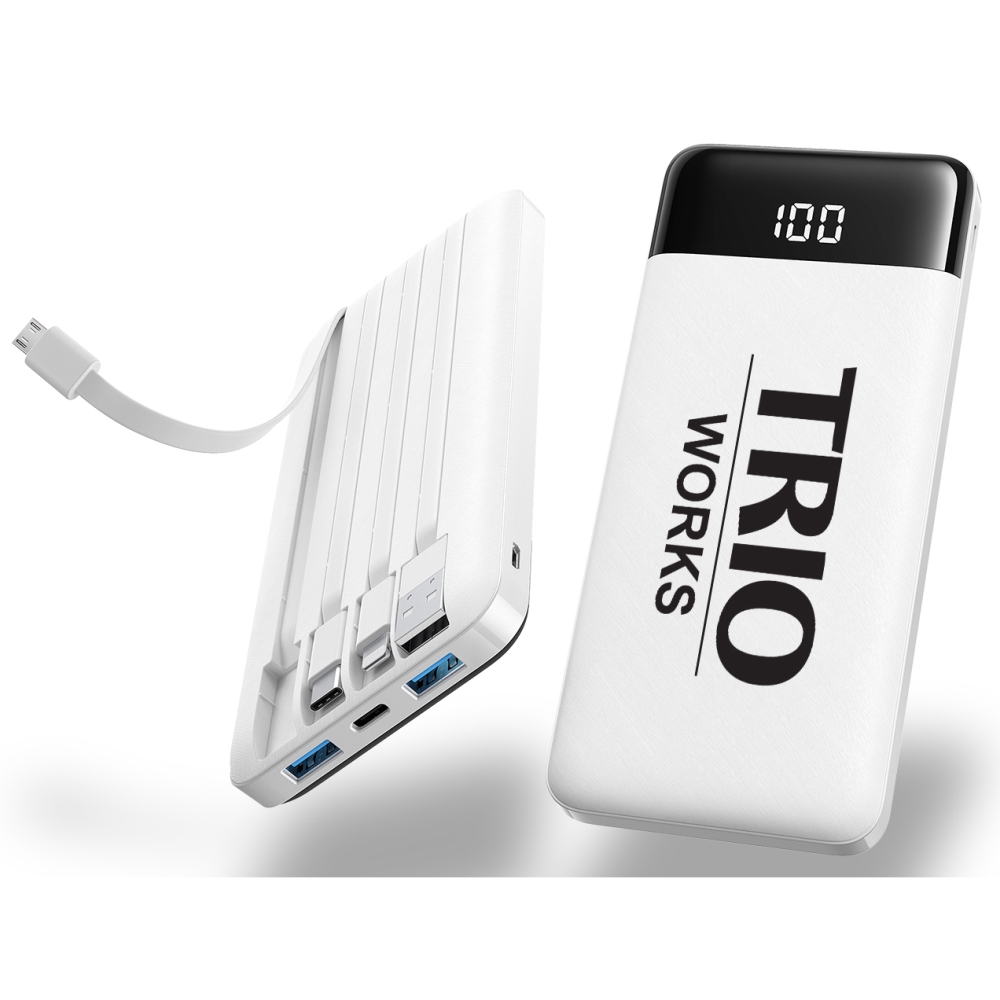 Introducing Axiom, our sleek and powerful new 10,000mAh power bank designed for maximum versatility on the go. With four built-in cables—USB, Micro USB, Type-C, and Lightning—plus additional USB and Type-C ports, Axiom keeps all your devices charged without the clutter. Its textured ABS casing and digital power display combine durability and sophistication for effortless everyday use.