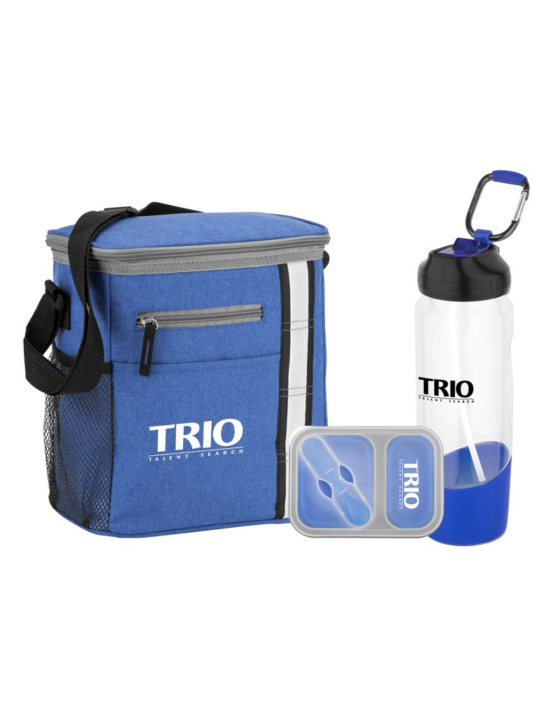Three piece gift set with 28 oz. Tritan Water Bottle w/Carabine, Lunch on the Go Lunch Box, and Day Trip Lunch Bag.