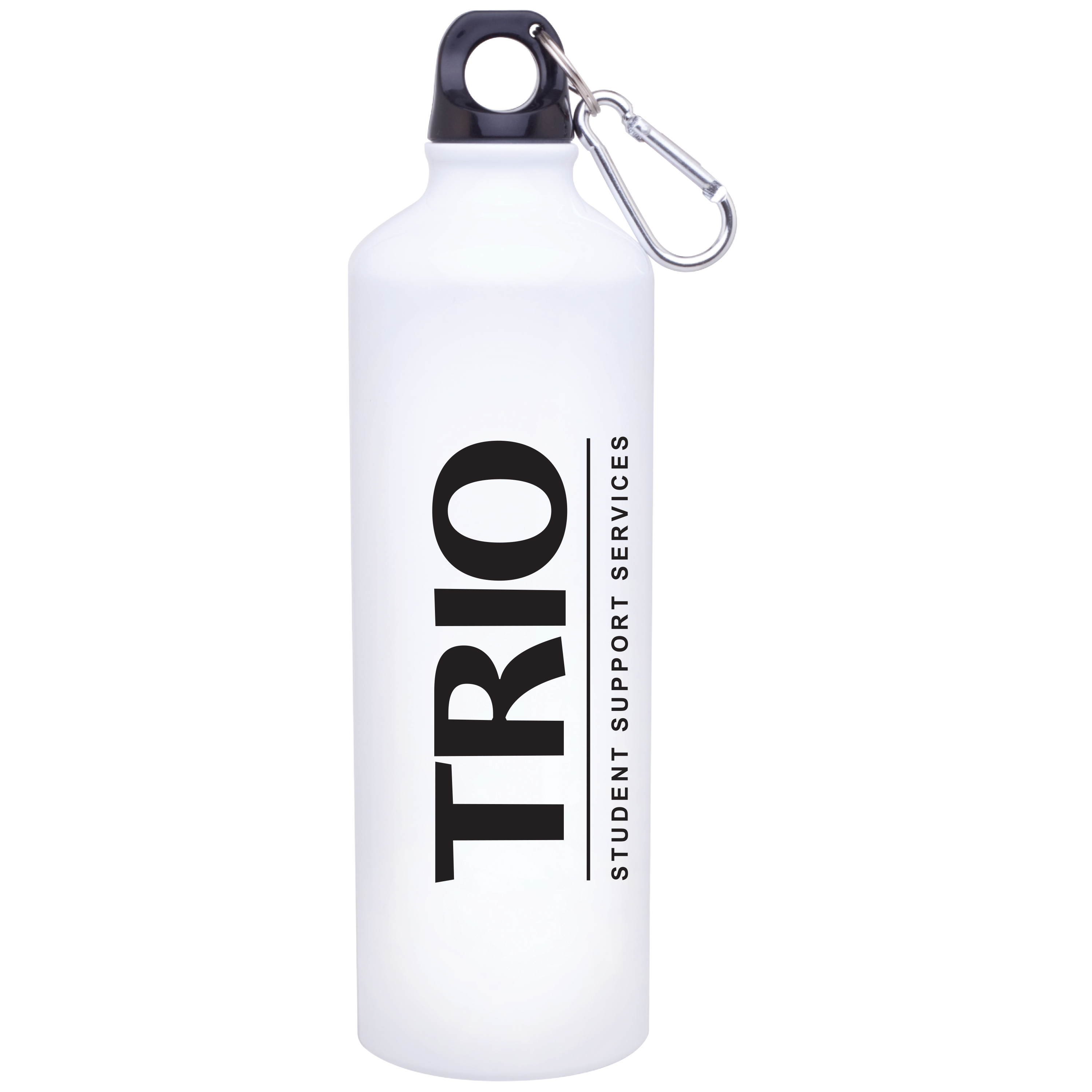 24 oz single wall aluminum water bottle with threaded lid, carabiner, and key ring · carabiner and key ring polybagged inside bottle.