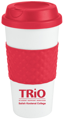 16oz Double wall insulation, Classic white plastic coffee cup, Contrasting bold color silicone texture grip center band, Matching color plastic twist-on lid, Not microwave or dishwasher safe.
