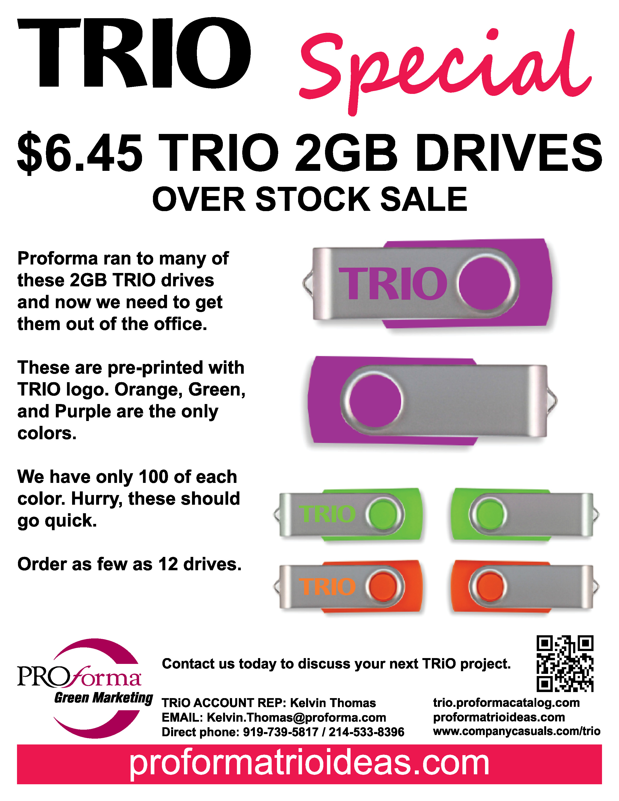 If you have any questions or wish to order, please email or call your Proforma TRIO representative Kelvin Thomas / 919-739-5817.