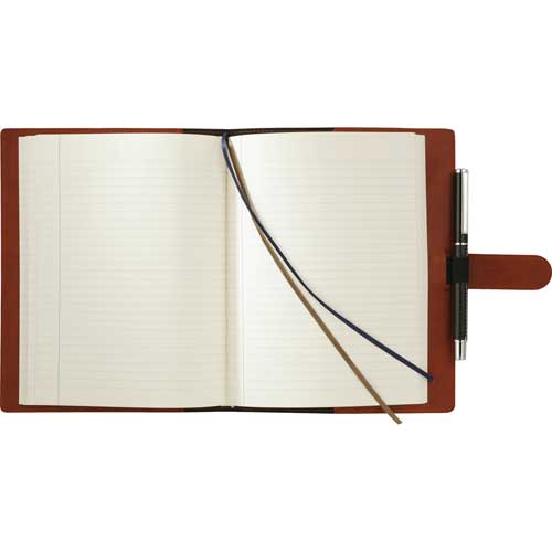 Dovana JournalBook Elastic pen loop. Tab and loop closure. Blue and silver ribbon page markers. Business card slot. 80 sheets lined refill.