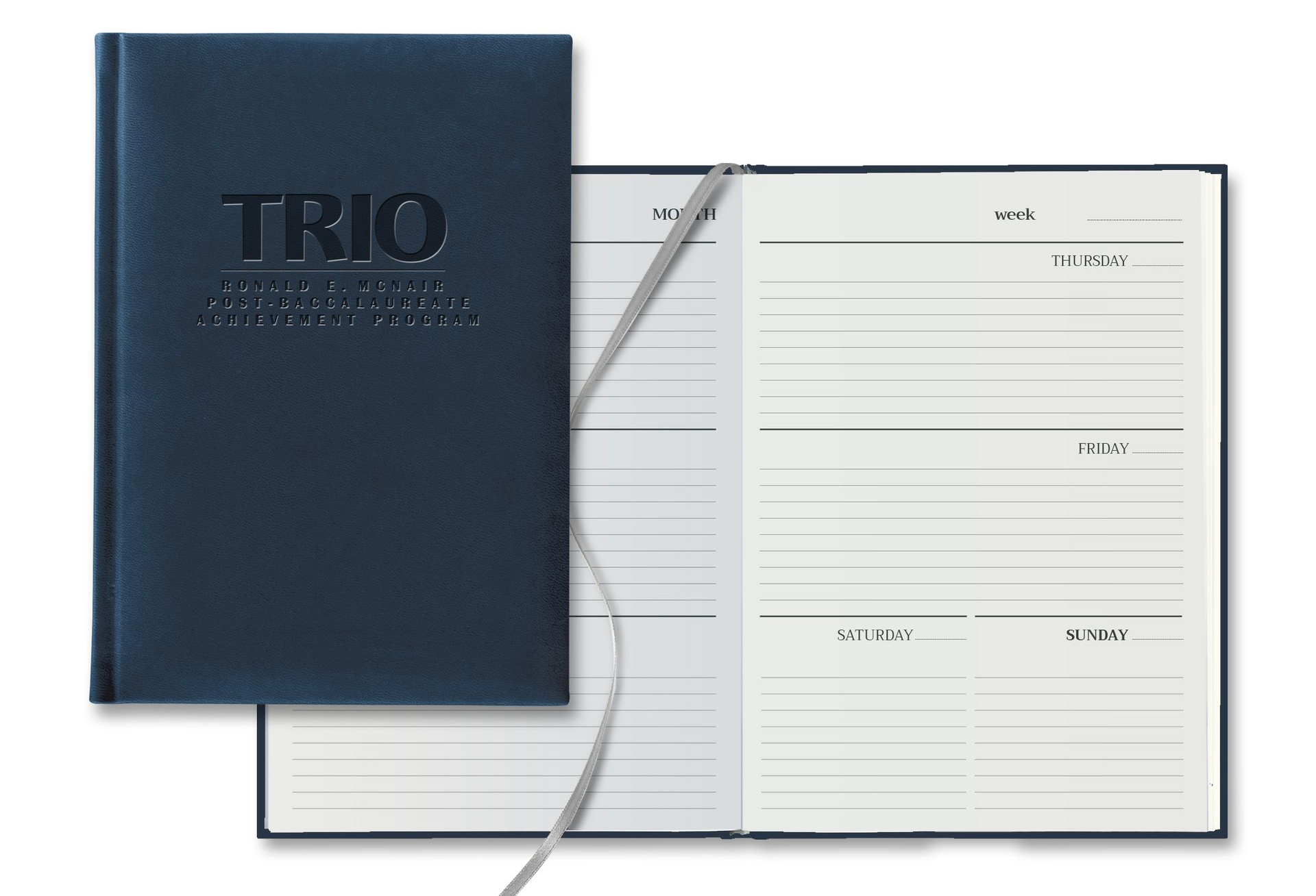 Measuring 7″ x 9 11/16″, this planner features a cover that has a smooth surface that’s often mistaken for leather This planner has the ability to be started any day, week or month! It’s also equipped with 192 white pages with black and gray printing and a silver ribbon marker.