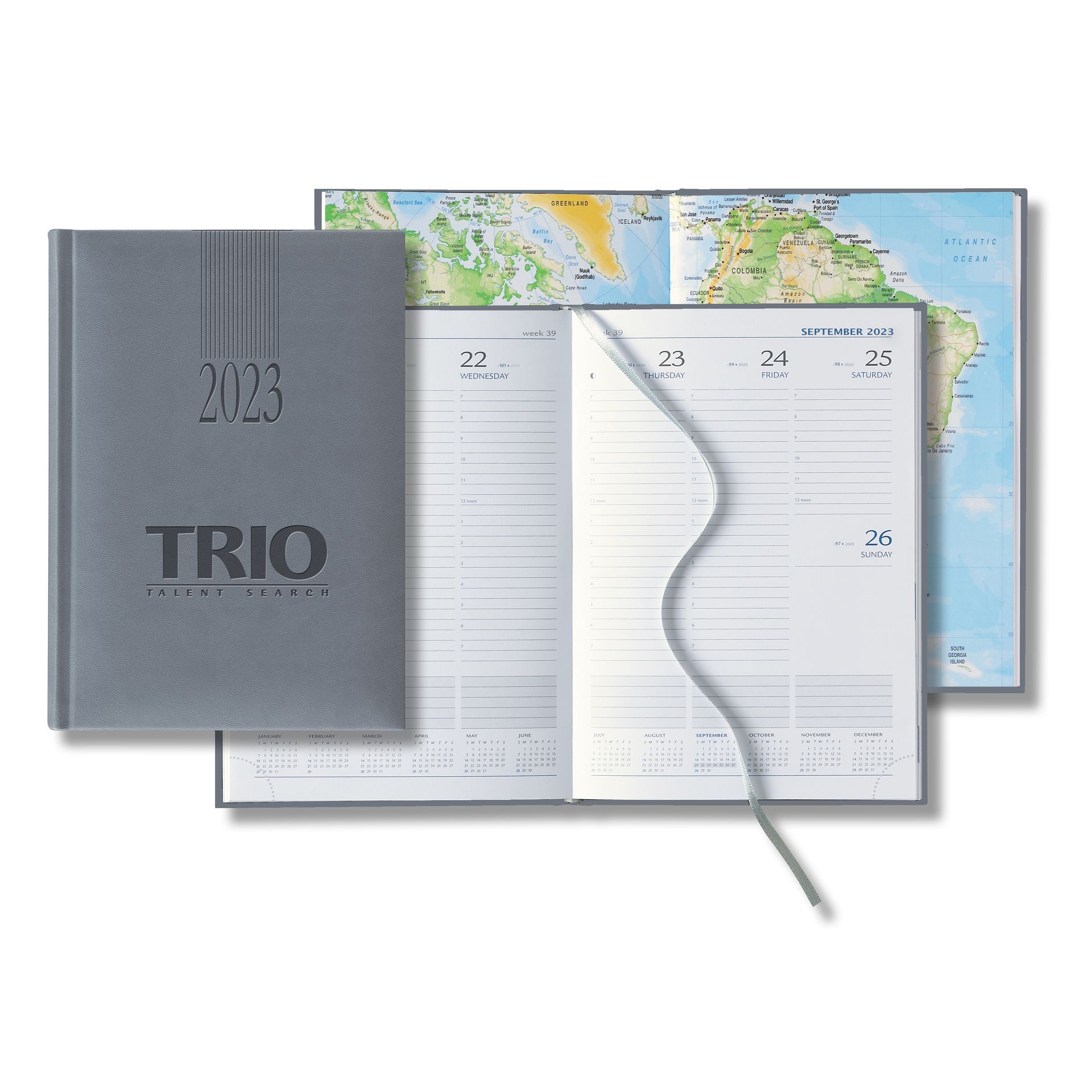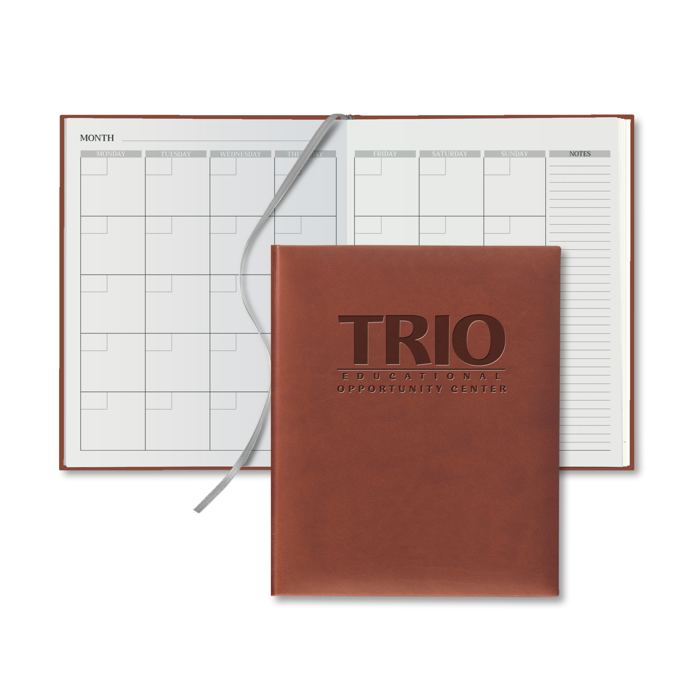 Bigger is better, and that’s the idea behind our 8 1/2″ x 10 1/2″ large desk weekly planner! A great place to keep dates, appointments and reminders, this planner features 144 white pages with modern blue and gray print, a silver ribbon marker with printed year date, perforated corners, 16 page removable address book and an extensive reference index with national/international holidays, yearly planner, conversion tables and commonly used relevant lists. The cover has a soft textured surface accented with hand stitched around the perimeter, comes in an assortment of bold colors and can be imprinted with a brand name or logo.