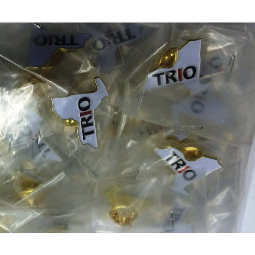 TRIO Talent Search Lapel Pins. Sold as shown. Bag of 50 pins. “TRO” capital letters in black, with “I” in red. 1″ x ~ 5/8″ Die Struck Lapel Pin. Bright Goldtone Finish. Black, White, Red (PMS 186c) Soft Enamel Colorfill. Individually polybagged.