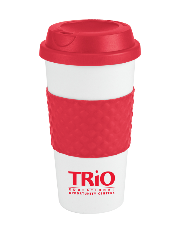 16oz Double wall insulation, Classic white plastic coffee cup, Contrasting bold color silicone texture grip center band, Matching color plastic twist-on lid, Not microwave or dishwasher safe.