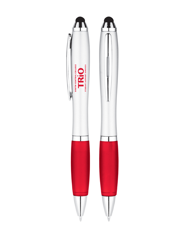 Rich metallic silver barrel, Shiny silver accents, Twist action pen, Soft rubber tip designed to mimic the pad of your finger – keeps your touch screen fingerprint free and contrasting bright color rubberized comfort grip.