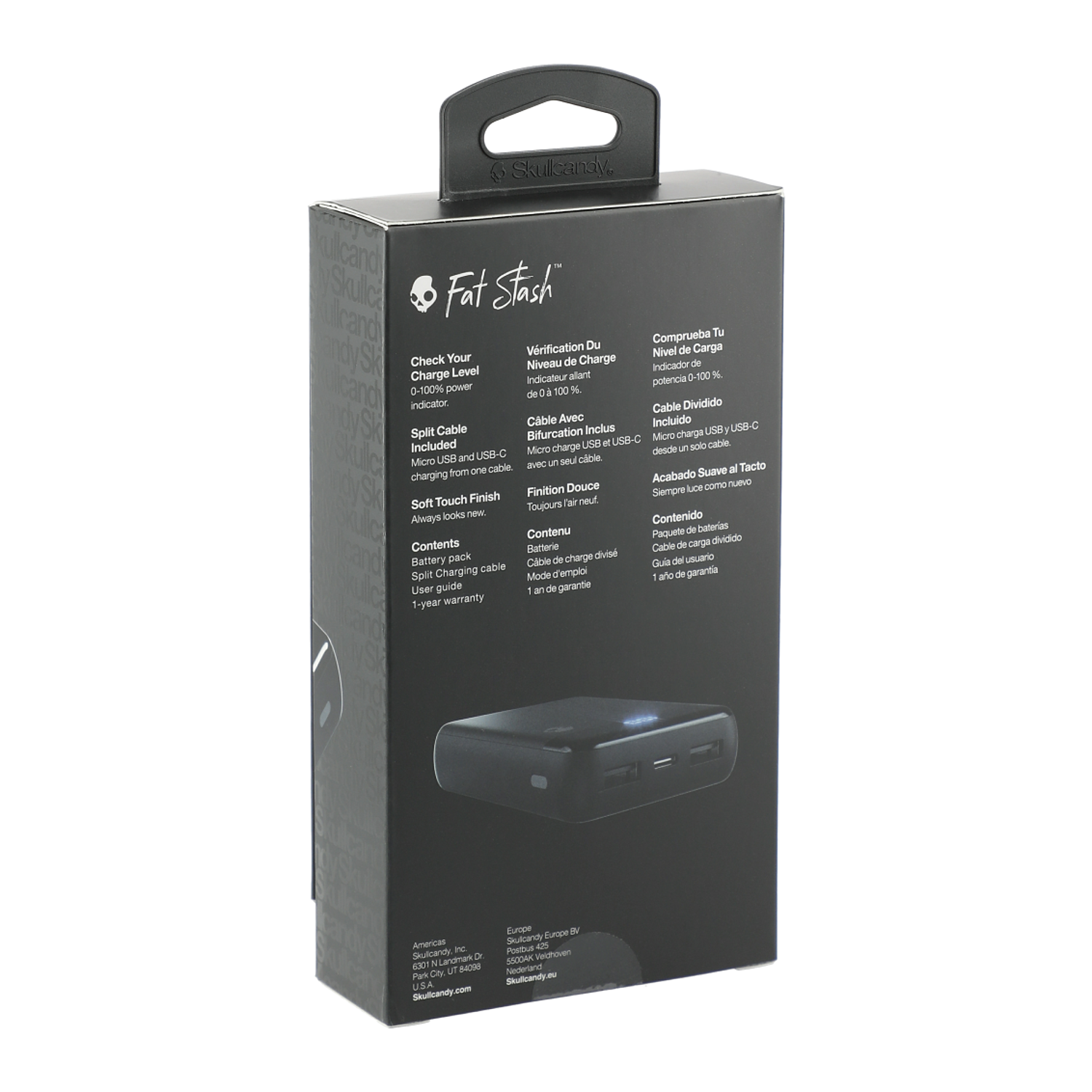 The Skullcandy Fat Stash Power Bank combines a 10000 mAh Grade A Lithium Ion battery with a digital power display. You can charge up three devices at one time with a Type C port of 5V/2.4A output and two USB-A ports with a max output of 5V/2.4A. Includes a USB-A to Micro and USB-C charging cable and a premium gift box